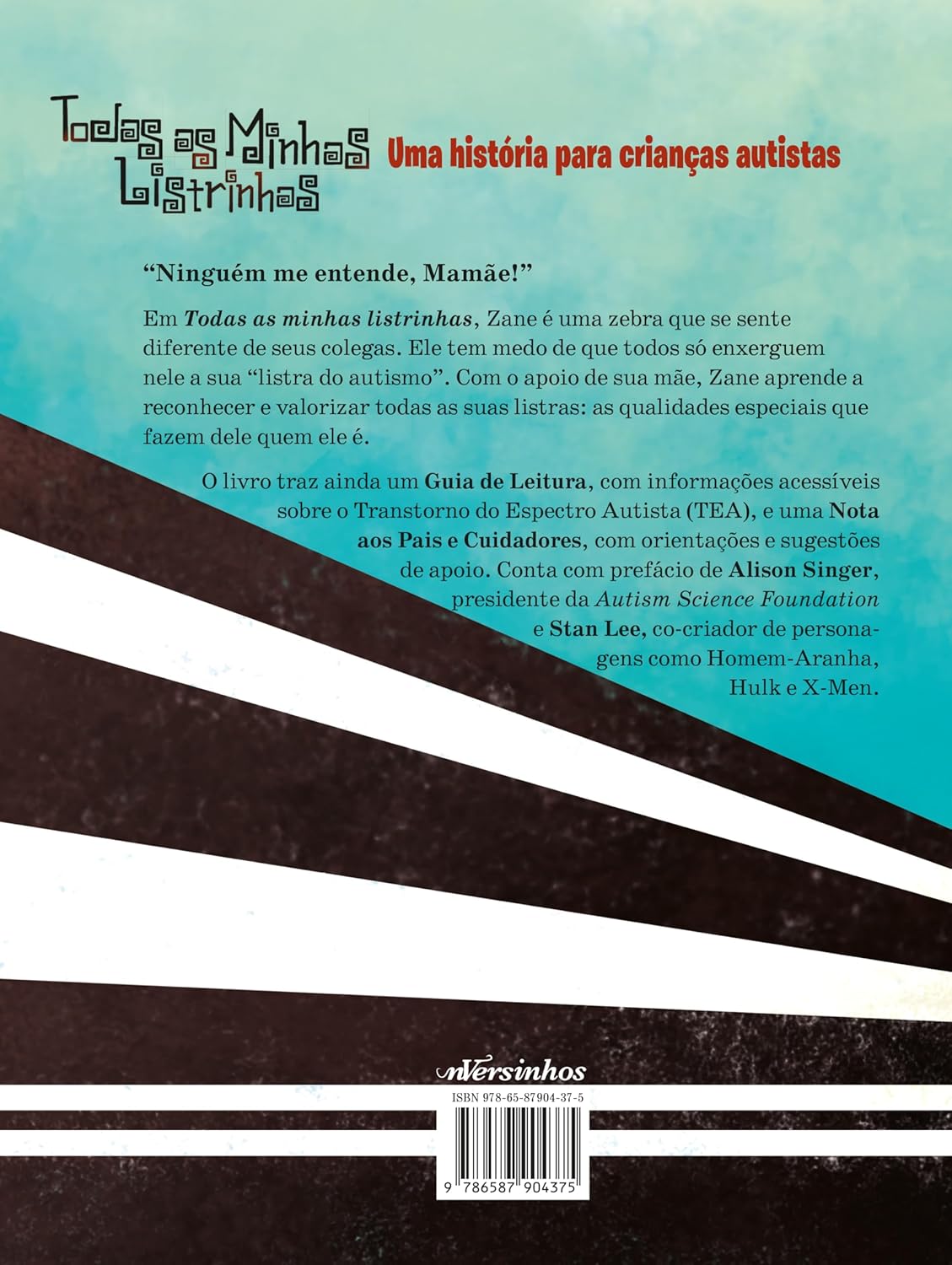 Em Todas as minhas listrinhas, Zane é uma jovem zebra que teme que os outros enxerguem apenas sua “listra do autismo”. Com o apoio de sua mãe, ele aprende que possui muitas outras listras — qualidades, talentos e características que o tornam único. De forma sensível e acolhedora, a história fala sobre autismo, autoestima, empatia e aceitação das diferenças, ajudando crianças a compreenderem a importância de valorizar quem somos e respeitar a diversidade.